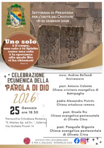 Domenica 25 gennaio alle ore 18.30, nella Parrocchia ortodossa rumena di San Matteo Apostolo ed Evangelista in Salerno, padre Alexandru Pistritu e la sua comunità accoglieranno S.E. Mons. Andrea Bellandi, il pastore Pasquale Gigante, il pastore Gioele Rio e il pastore Antonio Celenta per la Celebrazione ecumenica della Parola di Dio in occasione ...