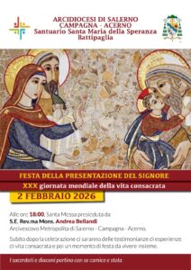 Lunedì 2 febbraio 2026, alle ore 18.00, presso il Santuario Santa Maria della Speranza a Battipaglia, in occasione della Festa della Presentazione del Signore, l’Arcidiocesi di Salerno – Campagna – Acerno celebrerà la XXX Giornata Mondiale della Vita Consacrata. L’evento prevede la Santa Messa presieduta da S.E. Mons. Andrea ...