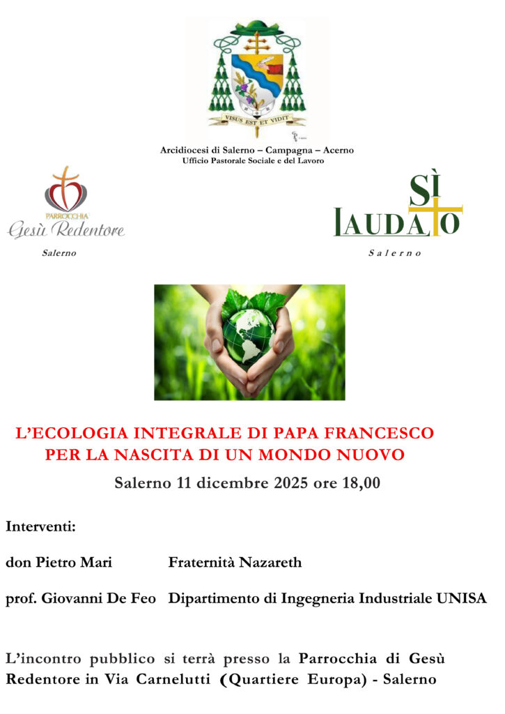 Giovedì 11 dicembre alle ore 18.00, presso la parrocchia di Gesù Redentore, si terrà un incontro dal titolo “L’ecologia integrale di Papa Francesco per la nascita di un mondo nuovo” organizzato dall’Ufficio Diocesano per la Pastorale Sociale e del Lavoro.