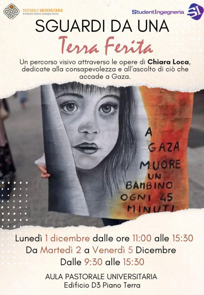 La Pastorale Universitaria dell’Arcidiocesi propone “Sguardi da una Terra Ferita”, un itinerario espositivo realizzato attraverso le opere dell’artista Chiara Loca, dedicate alla sensibilizzazione e all’ascolto di quanto sta accadendo a Gaza.L’iniziativa si terrà presso l’Aula della Pastorale Universitaria (Edificio D3 ...