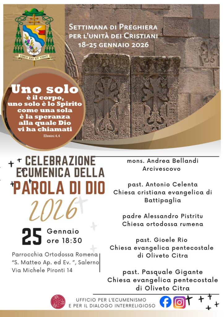 Domenica 25 gennaio alle ore 18.30, nella Parrocchia ortodossa rumena di San Matteo Apostolo ed Evangelista in Salerno, padre Alexandru Pistritu e la sua comunità accoglieranno S.E. Mons. Andrea Bellandi, il pastore Pasquale Gigante, il pastore Gioele Rio e il ...