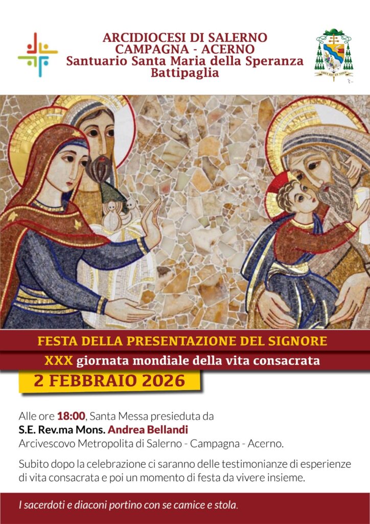 Lunedì 2 febbraio 2026, alle ore 18.00, presso il Santuario Santa Maria della Speranza a Battipaglia, in occasione della Festa della Presentazione del Signore, l’Arcidiocesi di Salerno – Campagna – Acerno celebrerà la XXX Giornata Mondiale della Vita Consacrata. L’evento ...