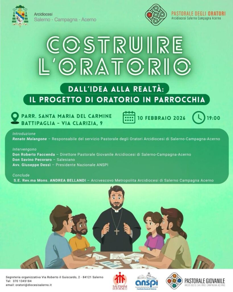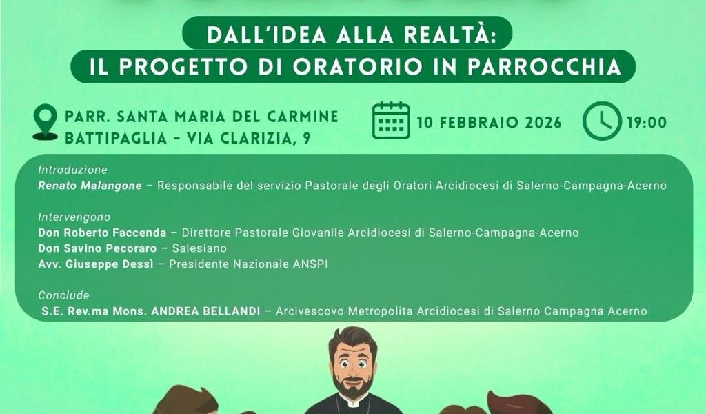 Martedì 10 febbraio, alle ore 19.00 presso la parrocchia Santa Maria del Carmine, Battipaglia, si terrà l’incontro dal titolo “Costruire l’Oratorio – dall’Idea alla Realtà: Il Progetto Oratorio in Parrocchia”. Un evento organizzato dalla Pastorale degli Oratori che si propone ...