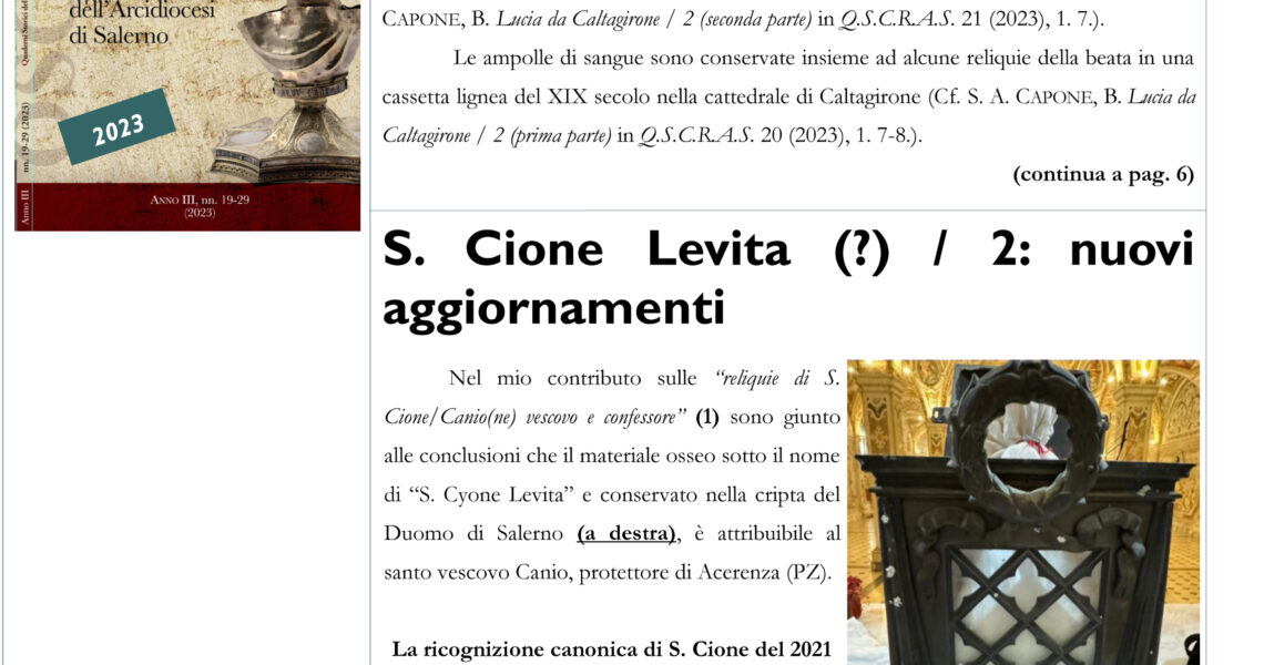 Nell’edizione QSCRAS numero 6 del mese di giugno, in apertura, troviamo due approfondimenti: il primo è uno studio sulle analisi condotte su due ampolle vitree contenenti il sangue della Beata Lucia da Caltagirone; il secondo approfondimento contiene le conclusioni sulle ...