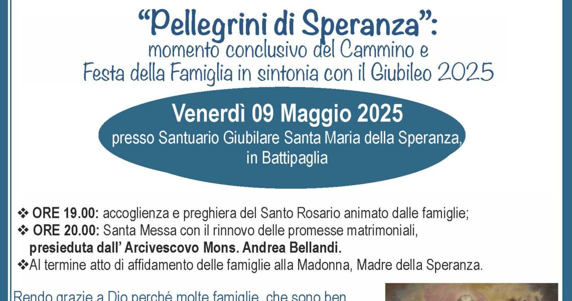 Venerdì 9 maggio, presso il Santuario Giubilare “Santa Maria della Speranza”, in Battipaglia si terrà la Festa Giubilare della Famiglia che rappresenta il momento conclusivo del Cammino di formazione proposto dall’Ufficio Diocesano di Pastorale della Famiglia in questo anno Pastorale 2024-25. ...