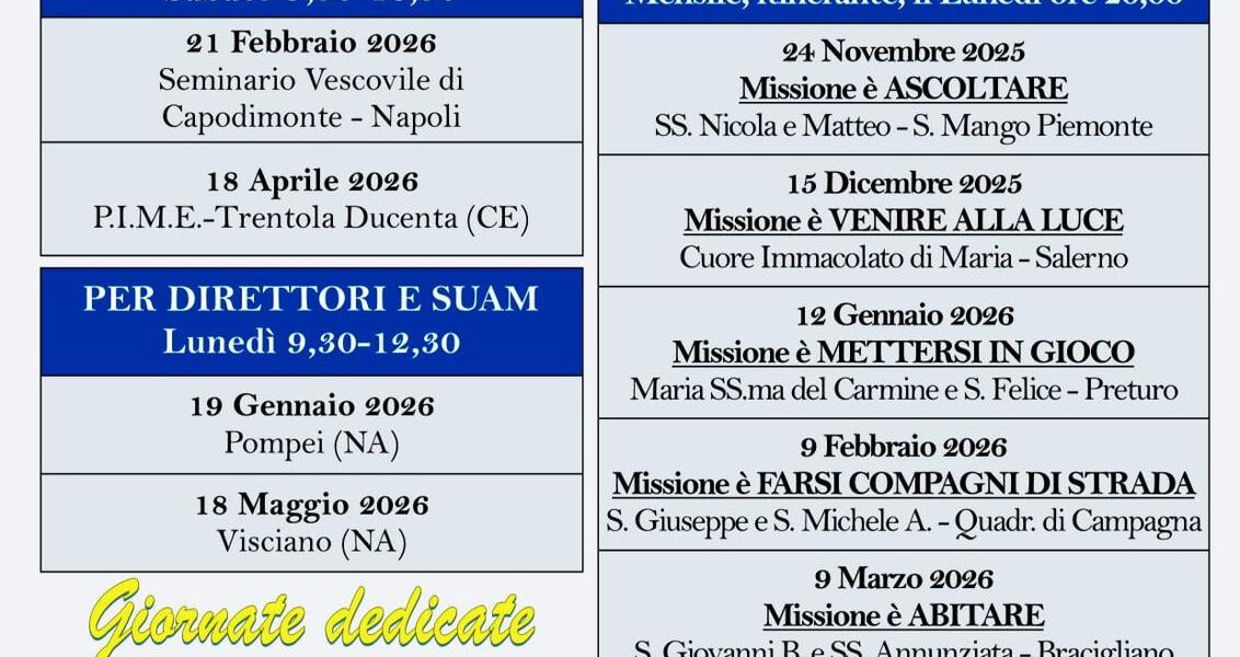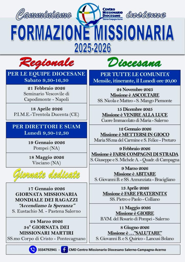 Il Centro Missionario Diocesano di Salerno-Campagna-Acerno, Ufficio Diocesano per la promozione della cooperazione missionaria, proseguendo il cammino di conoscenza e condivisione delle esperienze delle tante comunità della diocesi, propone anche quest’anno un percorso formativo aperto a tutti, con particolare attenzione ...