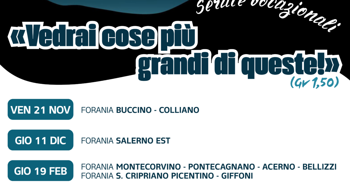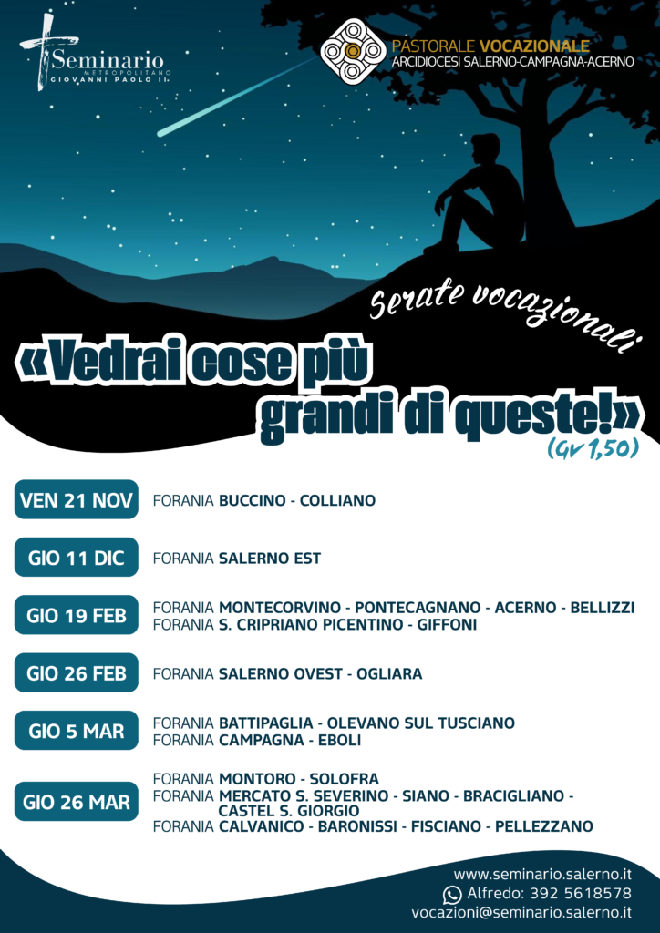 Il Seminario Metropolitano “Giovanni Paolo II”, in collaborazione con la Pastorale Vocazionale, propone una serie di serate vocazionali che si terranno nelle foranie dell’Arcidiocesi di Salerno-Campagna-Acerno. Papa Francesco invitava i giovani a «confrontarsi con grandi domande che non hanno una ...