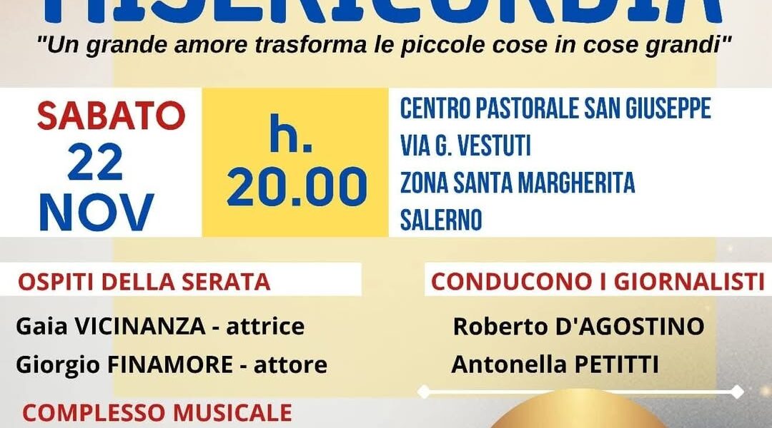 Sabato 22 novembre, alle ore 20.00, presso il Centro Pastorale San Giuseppe, in via G. Vestuti a Salerno si terrà la prima edizione del Premio della Misericordia, organizzata dall’Associazione Dives in Misericordia e dedicata ai valori dell’accoglienza e del servizio. ...