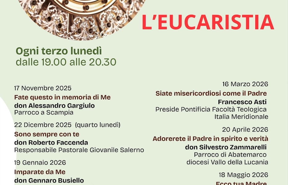 Il Movimento Pro Sanctitate propone un ciclo di catechesi sul tema “L’Eucaristia”, ospitato presso la Parrocchia dell’Immacolata di Salerno.Gli incontri si terranno ogni terzo lunedì del mese, avranno inizio alle 19.00, e saranno guidati da sacerdoti e docenti della Facoltà ...