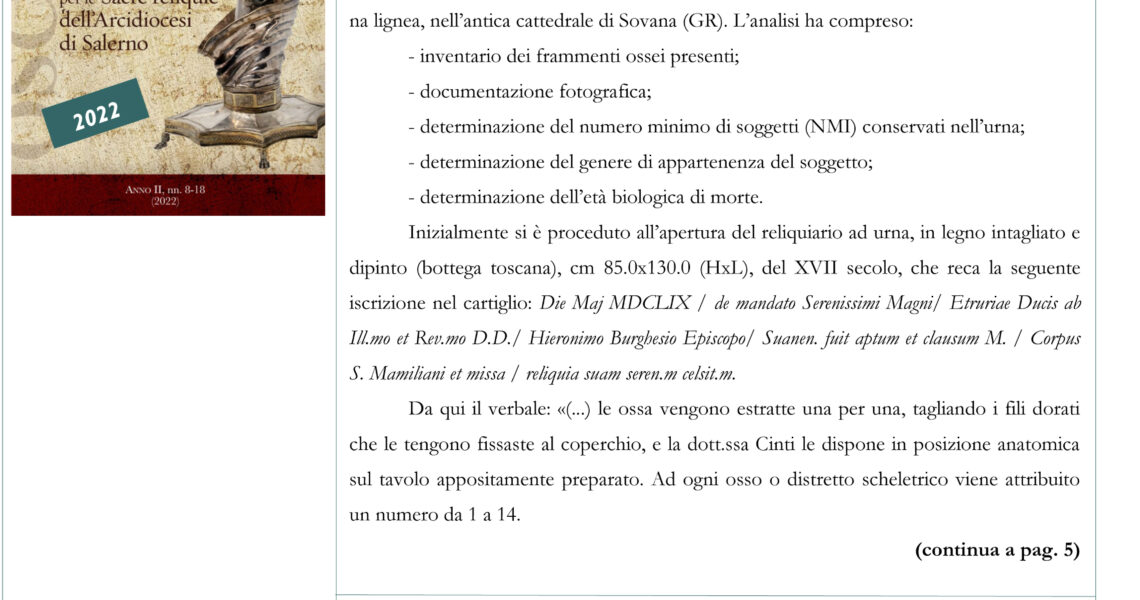 L’edizione QSCRAS numero 2, febbraio 2024, apre con la ricognizione canonica di S. Mamiliano vescovo di Palermo e di S. Massimo, vescovo di Nola. Nella rubrica Beati e Santi elenca le nuove acquisizioni delle reliquie provenienti dal monastero di San ...