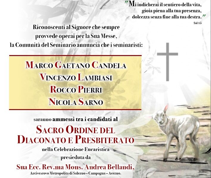 Giovedì 4 maggio, alle ore 19.00, presso la cappella maggiore del Seminario Metropolitano Giovanni Paolo II, durante la Solenne Celebrazione Eucaristica presieduta da S.E. Mons. Andrea Bellandi saranno ammessi tra i candidati all’Ordine Sacro del Diaconato e del Presbiterato, i seminaristi: Sem. ...