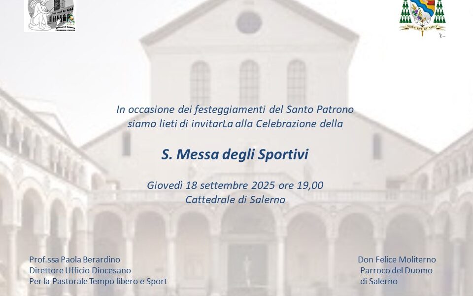 Giovedì 18 settembre alle ore 19.00 presso la Cattedrale di Salerno, nell’ambito dei festeggiamenti del Santo Patrono, si terrà la Santa Messa degli Sportivi organizzata dall’Ufficio Diocesano per lo Sport e Tempo Libero. Alla Celebrazione Eucaristica presieduta da S.E. Mons. ...