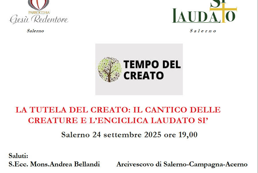 Mercoledì 24 settembre, alle ore 19.00, presso la Parrocchia di Gesù Redentore (Salerno), in occasione del “Tempo del Creato” spazio di riflessione e approfondimento della Giornata del Creato, l’Ufficio pastorale sociale e del lavoro dell’Arcidiocesi di Salerno-Campagna-Acerno propone un incontro ...