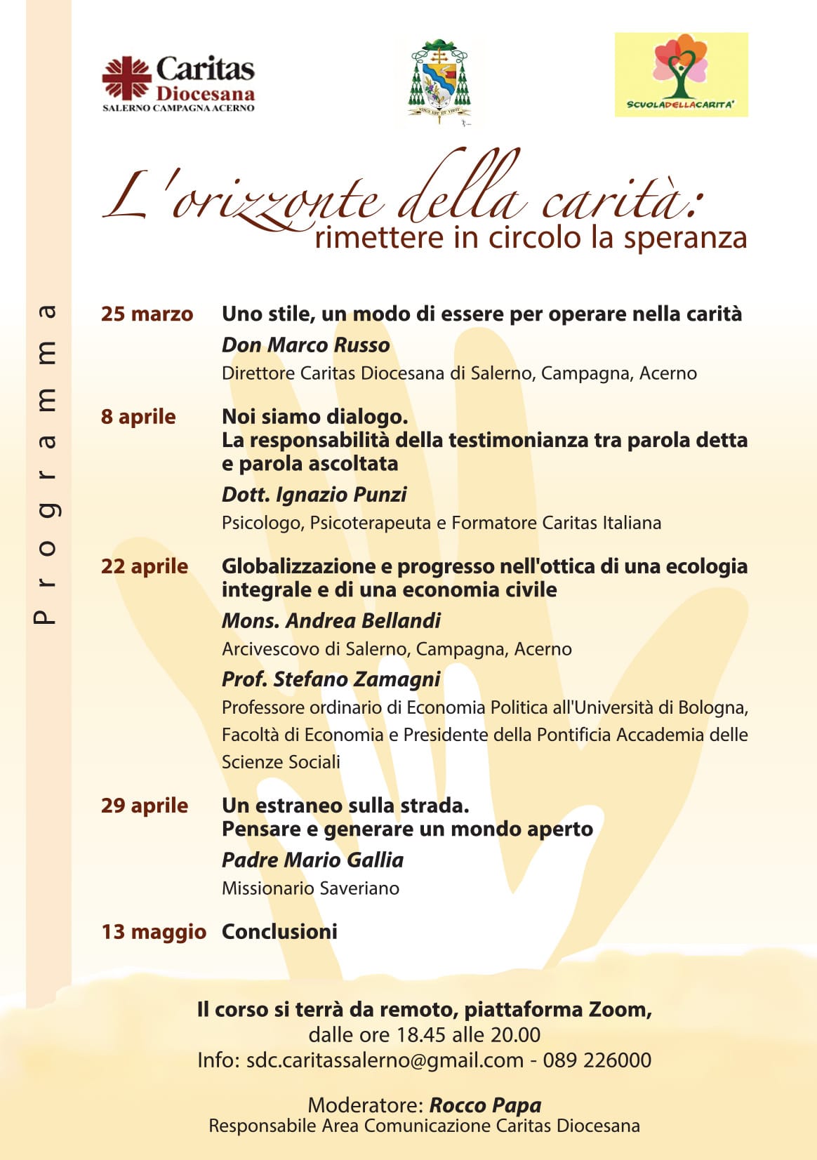 L’equipe della Promozione Caritas, anche quest’anno, ha organizzato un ciclo di incontri intitolato “L’orizzonte della carità: rimettere in circolo la speranza”Ciascun incontro si tiene da remoto, piattaforma Zoom, alle ore 18.45 e sarà moderato da Rocco Papa, responsabile dell’area della comunicazione Caritas diocesana.