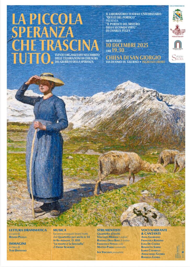 Mercoledì 10 dicembre alle ore 19.30, presso la rettoria di San Giorgio a Salerno, si terrà una lettura scenica de Il portico del mistero della seconda virtù di Charles Péguy, un’opera che pone al centro la virtù teologale della speranza ...