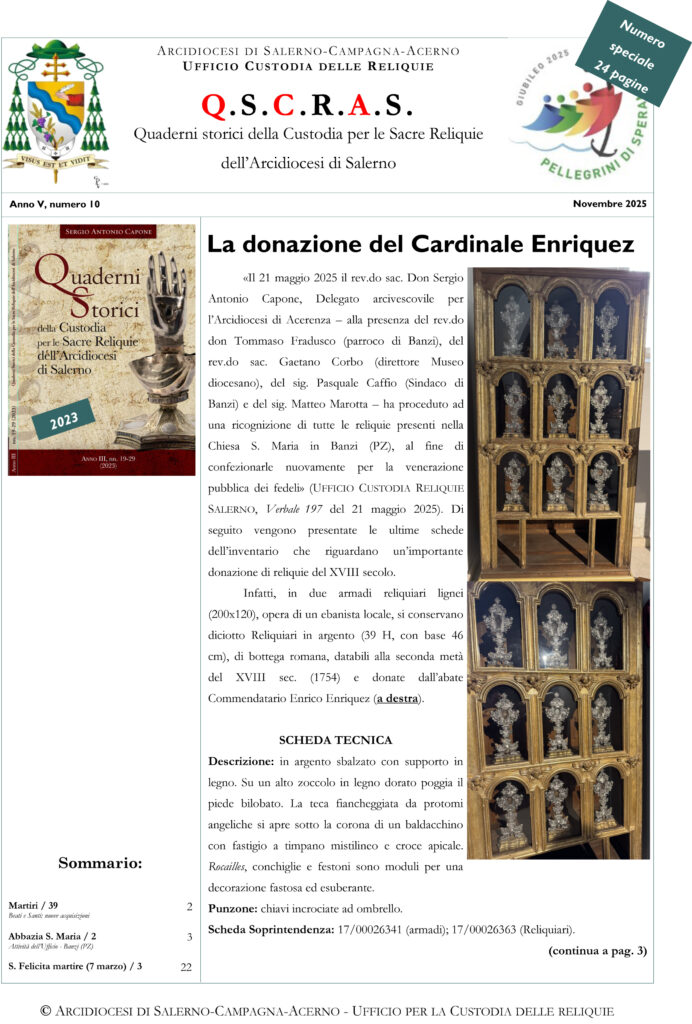 L’edizione QSCRAS n. 10, novembre 2025, si apre con una ricognizione delle reliquie presenti nella Chiesa di S. Maria in Banzi (PZ), alle quali è dedicato questo numero speciale di 24 pagine. Nella rubrica “Beati e Santi” vengono presentate le ...
