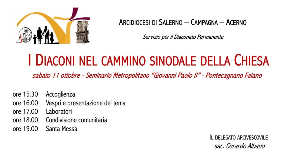 Sabato 11 ottobre p.v. presso il Seminario Metropolitano “Giovanni Paolo II” di Pontecagnano Faiano (SA) la Comunità diaconale dell’Arcidiocesi vivrà un momento di riflessione, fraternità e preghiera in sintonia con il percorso sinodale della Chiesa universale, insieme al Delegato Arcivescovile ...