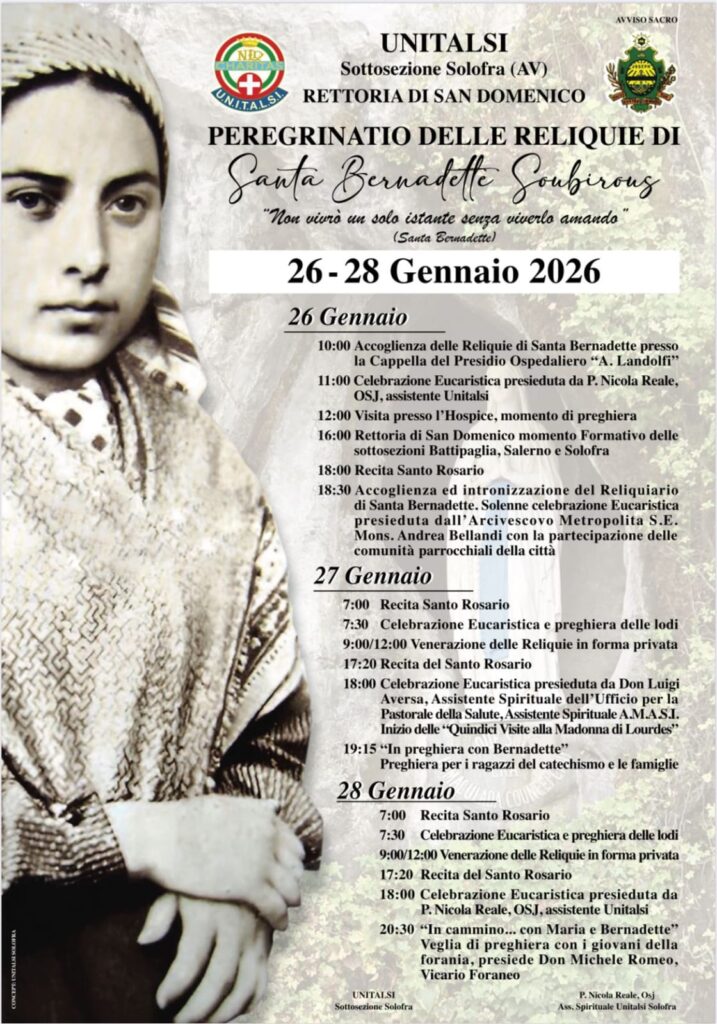 A partire da lunedì 26 e fino a mercoledì 28 gennaio, la comunità di Solofra vivrà un intenso momento di spiritualità e devozione. L’Unitalsi (la Sottosezione di Solofra), in collaborazione con la Rettoria di San Domenico, accoglierà le reliquie di ...