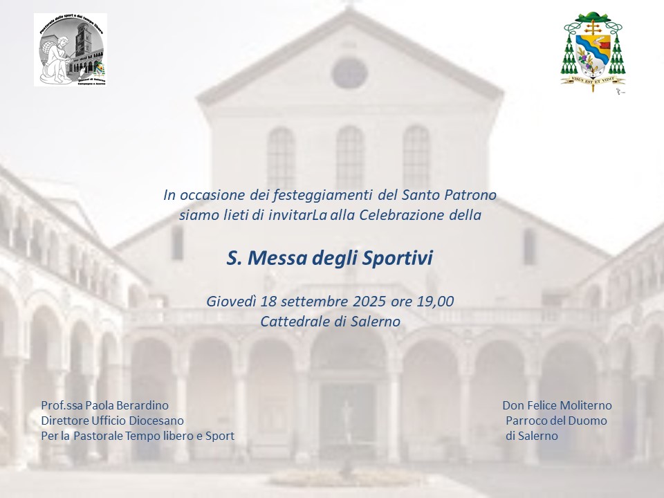 Martedì 12 settembre alle ore 19.00 presso la cattedrale di Salerno, nell’ambito dei festeggiamenti del Santo Patrono, si terrà la Santa Messa degli Sportivi organizzata dall’Ufficio Diocesano per lo Sport e Tempo Libero in collaborazione con la Delegazione Provinciale del CONI ...