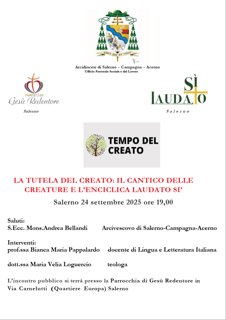 Mercoledì 24 settembre, alle ore 19.00, presso la Parrocchia di Gesù Redentore (Salerno), in occasione del “Tempo del Creato” spazio di riflessione e approfondimento della Giornata del Creato, l’Ufficio pastorale sociale e del lavoro dell’Arcidiocesi di Salerno-Campagna-Acerno propone un incontro ...