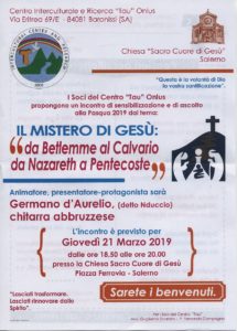 Giovedì 21 marzo alle ore 18.50 presso la parrocchia del Sacro Cuore di Gesù – Sala San Damiano si tiene un incontro di ascolto e formazioni dal tema “Da Betlemme al Calvario – da Nazareth a Pentecoste” organizzato dal Centro Interculturale e ricerca “Tau” Onlus, relaziona Germano d’Aurelio. .