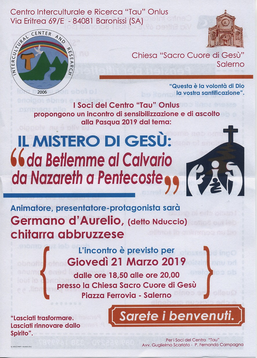 Giovedì 21 marzo alle ore 18.50 presso la parrocchia del Sacro Cuore di Gesù – Sala San Damiano si tiene un incontro di ascolto e formazioni dal tema “Da Betlemme al Calvario – da Nazareth a Pentecoste” organizzato dal Centro Interculturale e ricerca “Tau” Onlus, relaziona Germano d’Aurelio. .