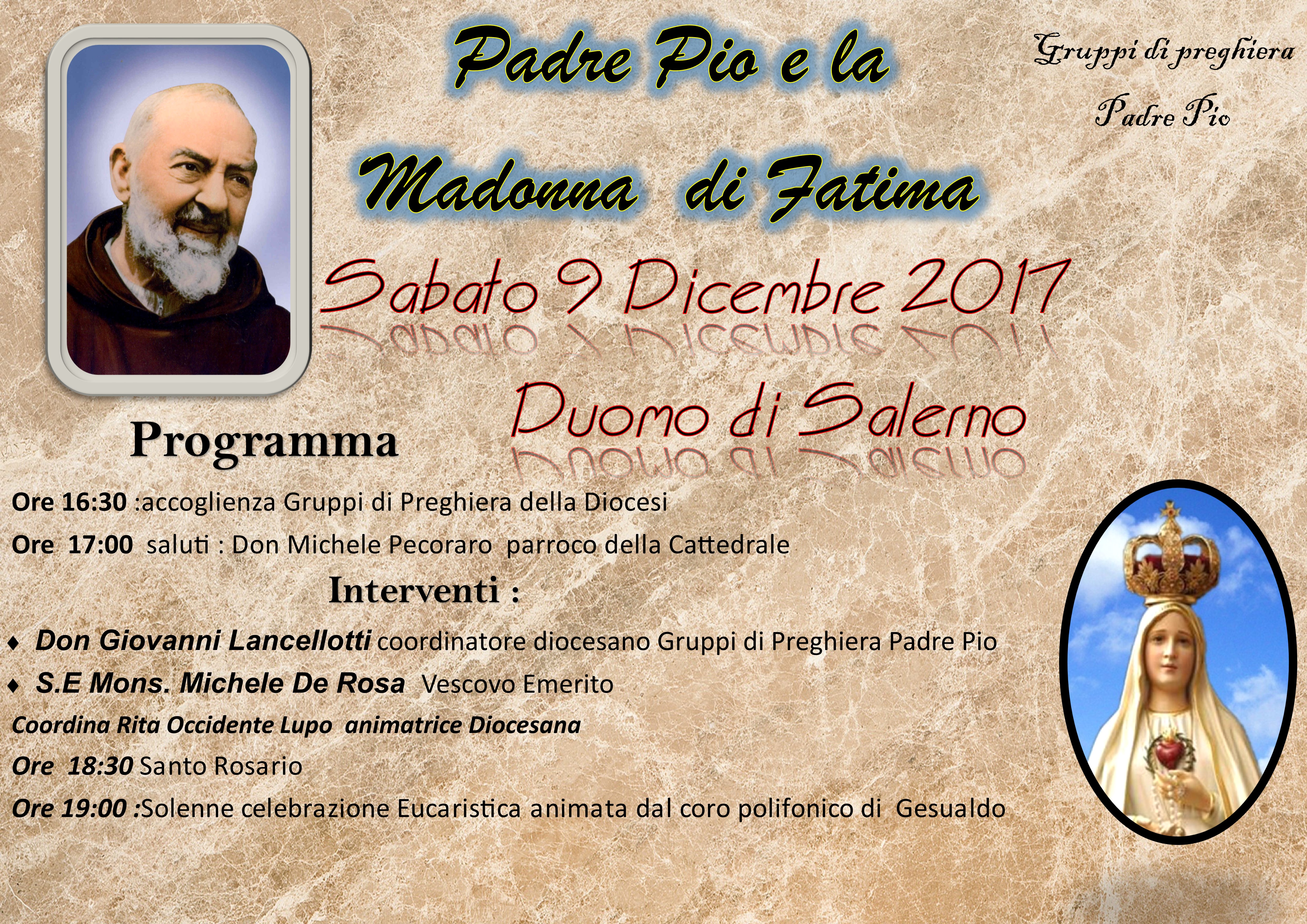 Sabato 9 dicembre, alle ore 17.00, nella Cattedrale di Salerno si tiene la chiusura del centenario delle apparizioni mariane. L’incontro voluto dai Gruppi di Preghiera Padre Pio e coordinato dall’animatrice diocesana Rita Occidente Lupo, registrerà il saluto del parroco del Duomo, don Michele Pecoraro, l’intervento di don Giovanni Lancellotti, coordinatore diocesano dei Gruppi di Preghiera, e l’intervento di S.E.Mons. Michele De Rosa, Vescovo emerito.