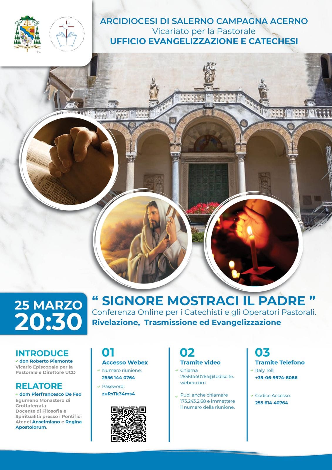 Lunedì 25 marzo alle ore 20.30 si terrà una conferenza online rivolta ai catechisti e agli operatori pastorali. Il titolo della conferenza è “Signore mostraci il Padre”, relaziona p. Pierfrancesco De Feo OSB, egumeno del monastero di Grottaferrata e docente di filosofia e spiritualità, organizzata dall’Ufficio Diocesano Evangelizzazione e Catechesi.