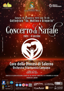 Sabato 16 dicembre alle ore 20.30 presso la Cattedrale Primaziale “S.S. Matteo e Gregorio” si terrà il tradizionale Concerto di Natale, che è arrivato alla XI edizione, del Coro della Diocesi di Salerno con l’Orchestra Filarmonica Campana. L’evento sarà trasmesso in diretta televisiva da TDS, canale 87 del digitale terrestre, e in streaming su YouTube, canale TDSTelevision.