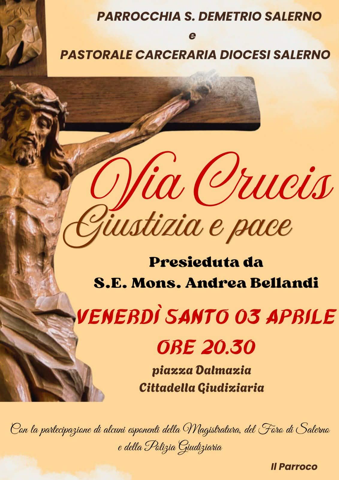È in programma il 3 aprile 2026, alle ore 20.30, in piazza Dalmazia, dinanzi alla Cittadella Giudiziaria, la Via Crucis “Giustizia e pace” presieduta dall’Arcivescovo di Salerno-Campagna-Acerno, S.E. Monsignor Andrea Bellandi e organizzata dalla Parrocchia San Demetrio Martire e dalla Pastorale Carceraria dell’Arcidiocesi. La comunità è invitata a vivere un momento intenso di preghiera e riflessione, nel segno della speranza e della responsabilità condivisa. “Pregare per la pace oggi significa impegnarsi concretamente affinché essa non sia solo assenza di conflitto, ma frutto autentico della giustizia. – osserva S.E. Monsignor Andrea Bellandi – Non può esserci vera pace senza il rispetto della dignità di ogni persona, senza verità, senza percorsi di riconciliazione e senza un impegno reale per il bene comune. L’appuntamento intende essere un segno visibile di dialogo e comunione tra realtà diverse ma profondamente unite nel servizio alla giustizia e alla persona”.