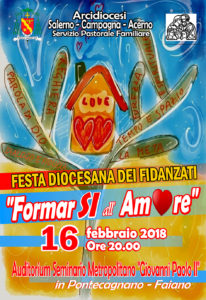 Venerdì 16 febbraio dalle ore 20.00, presso l’auditorium del Seminario Metropolitano “Giovanni Paolo II” di Pontecagnano Faiano, si tiene la Festa Diocesana dei Fidanzati presieduta da S.E. Mons. Luigi Moretti.