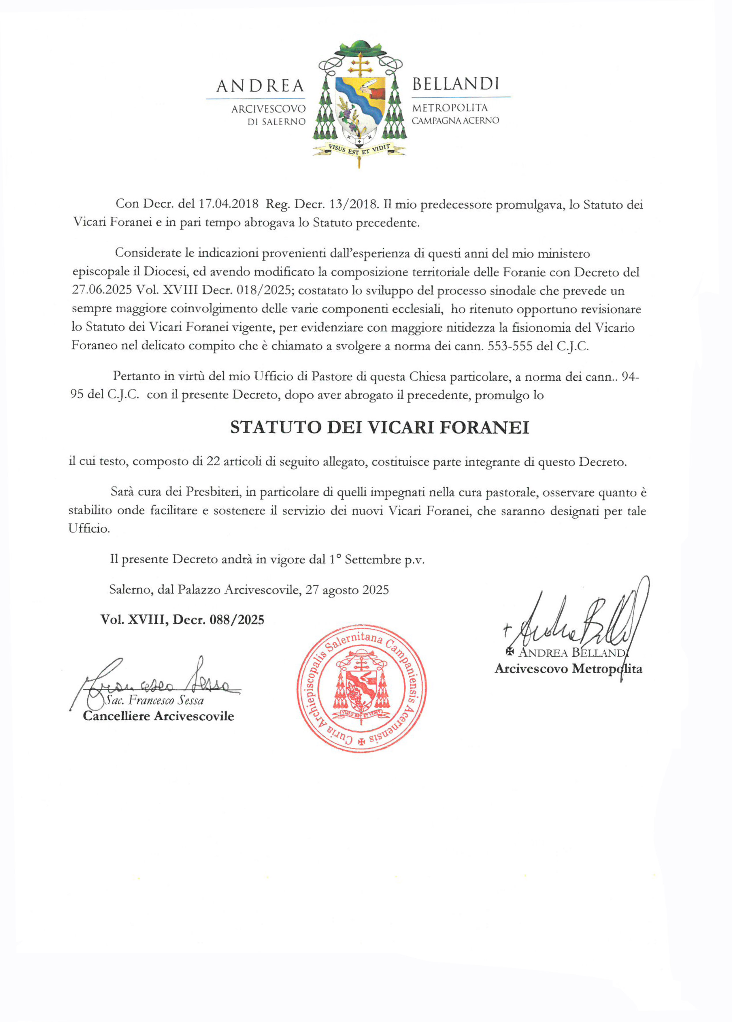 Dal primo settembre c.a., per il triennio 2025-2028, l’Arcivescovo S.E. Mons. Andrea Bellandi, a norma dei cann. 553-555 C.I.C. e dello Statuto vigente, anch’esso entrato in vigore il primo settembre, ha provveduto a nominare i Vicari Foranei: