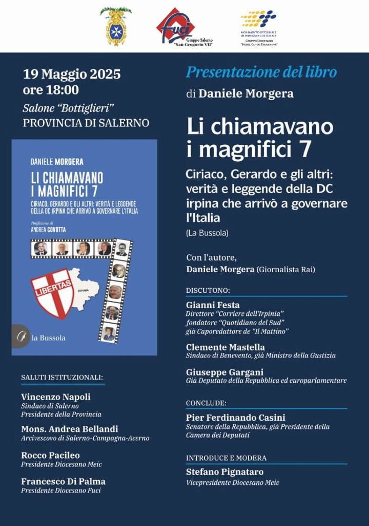 Lunedì 19 maggio alle ore 18.00 si svolgerà al Salone “Bottiglieri” della Provincia di Salerno, la presentazione del libro di Daniele Morgera (Giornalista Rai) “Li chiamavano i magnifici 7. Ciriaco, Gerardo e gli altri: verità e leggende della DC irpina che arrivò a governare l’Italia” (La Bussola).