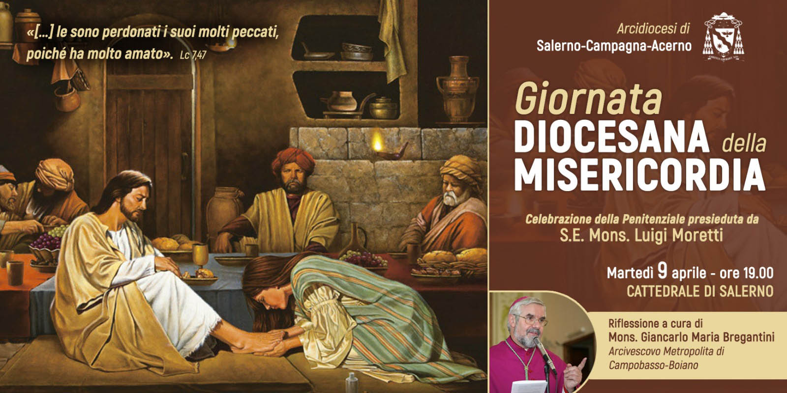 Quest’anno la Giornata Diocesana della Misericordia sarà celebrata martedì 9 aprile presso la Cattedrale di Salerno, alle ore 19.00. Ci sarà una celebrazione penitenziale presieduta dall’Arcivescovo Monsignor Luigi Moretti con una riflessione spirituale tenuta da Mons. Giancarlo Maria Bregantini, Arcivescovo di Campobasso.