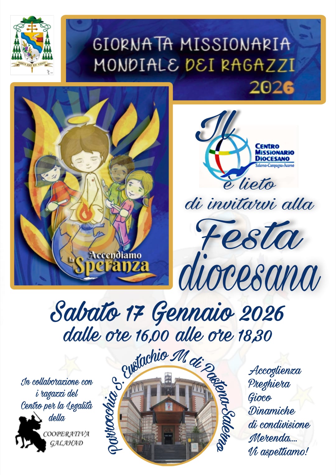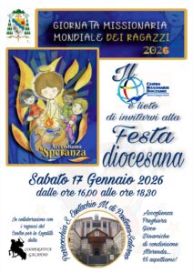 Sabato 17 gennaio alle ore 16.00 presso la parrocchia S. Eustachio Martire di Pastena, Salerno, si terrà la Festa Diocesana della Giornata Missionaria Mondiale dei Ragazzi.