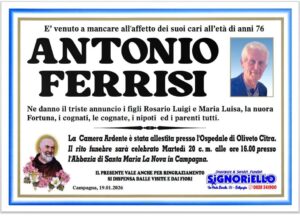 Il rito funebre sarà celebrato oggi, martedì 20 gennaio, alle ore 16.00 presso l’Abbazia di Santa Maria La Nova in Campagna.