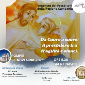 Venerdì 28 novembre, alle ore 9.30, presso la Sala Trapani in Pompei, avrà luogo l’Incontro dei Presbiteri della Regione Campania, sul tema “Da cuore a cuore: il presbitero tra fragilità e slanci.”Dopo l’introduzione e i saluti di S.E. Mons. Francesco Beneduce, Vescovo Delegato della Commissione Clero, interverranno: