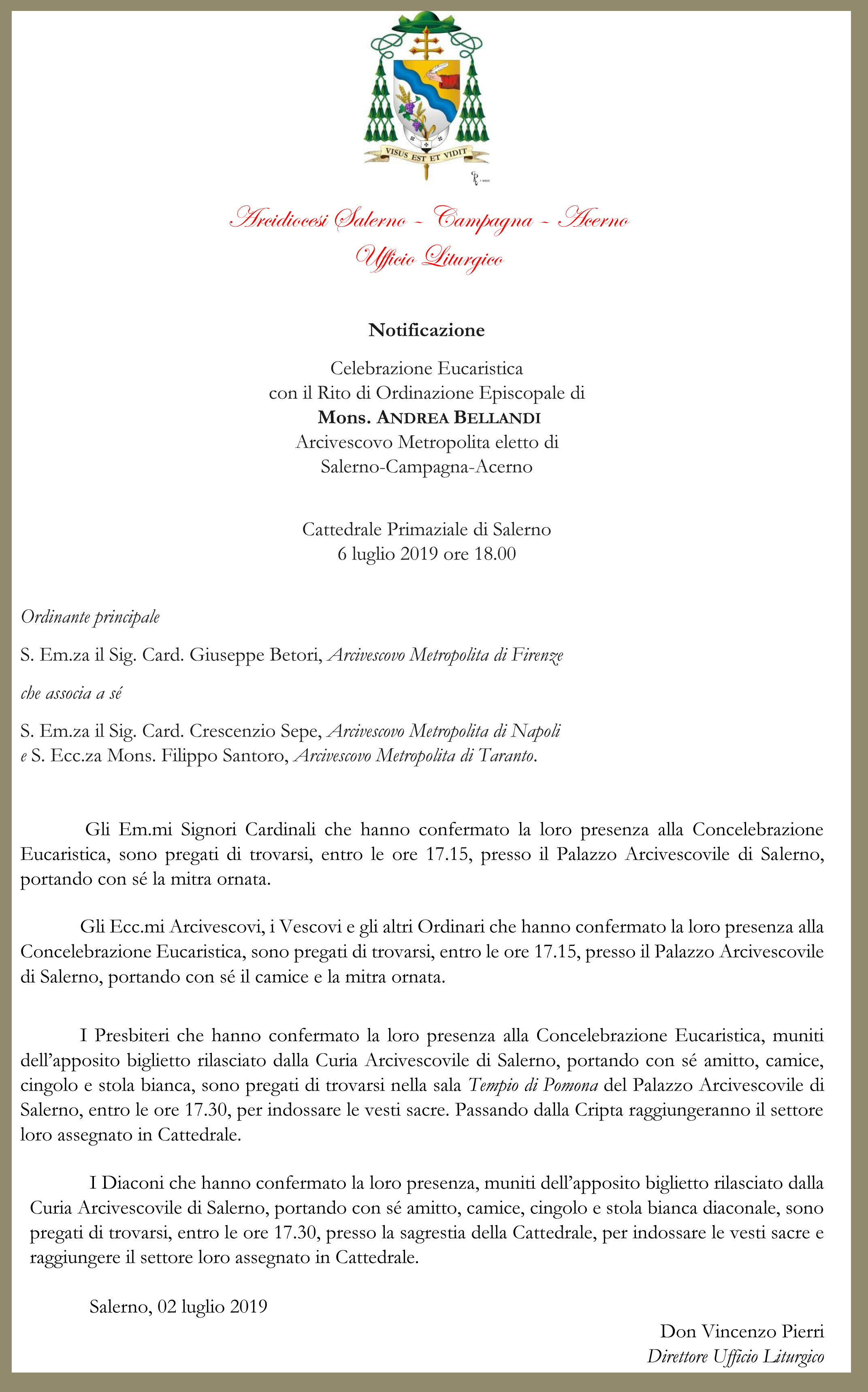 I Presbiteri dell’Arcidiocesi di Salerno-Campagna-Acerno che desiderano prendere parte all’ordinazione episcopale di Mons. Andrea Bellandi sono pregati di confermare la propria partecipazione attraverso le modalità già loro comunicate, entro il 15 giugno 2019.