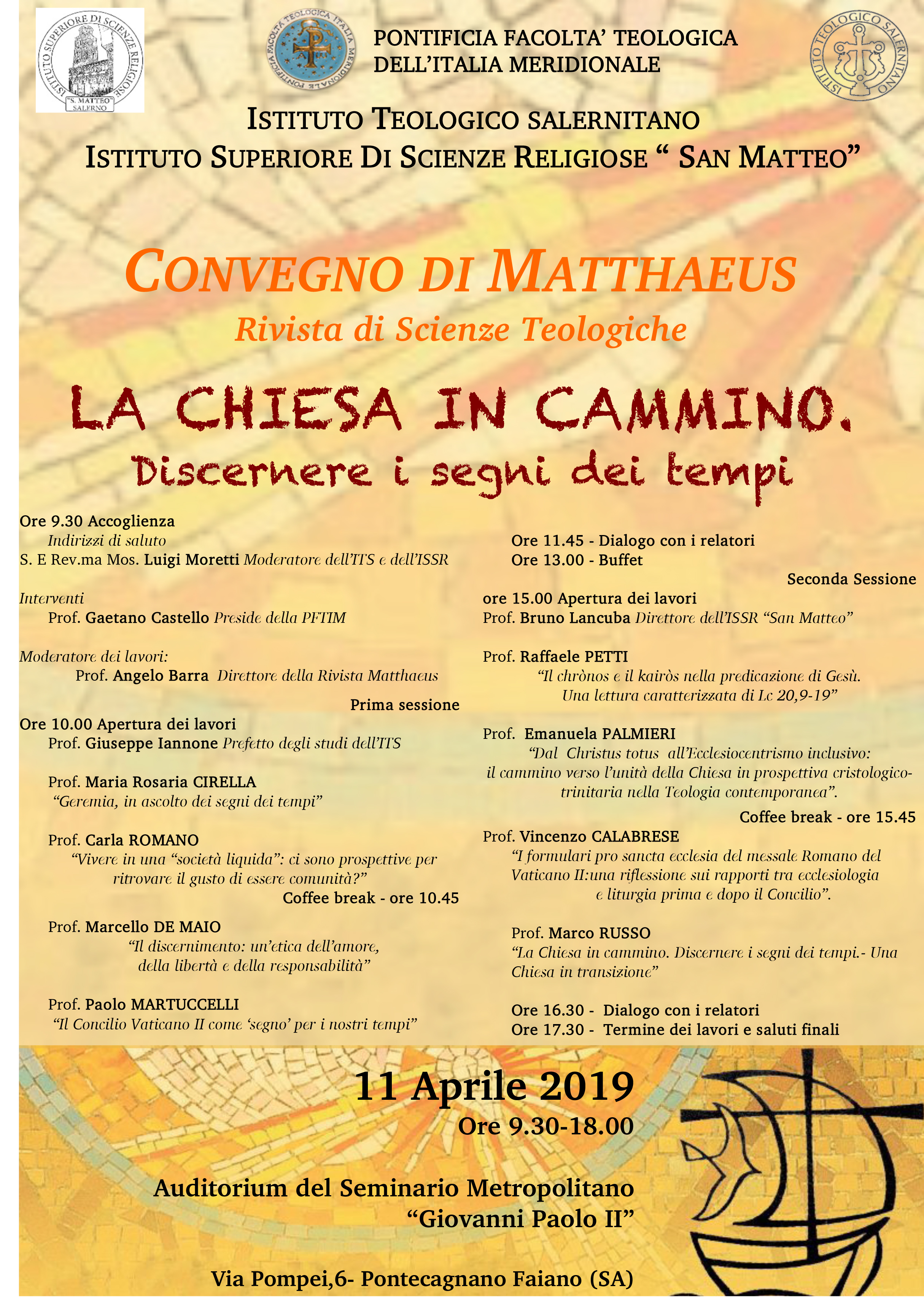 Giovedì 11 aprile dalle ore 9.30 si tiene un convegno dal titolo “La Chiesa in cammino. Discernere i segni dei tempi” organizzato dalla rivista Mattheus in collaborazione con l’Istituto Teologico Salernitano e l’Istituto Superiore di Scienze Religiose “San Matteo” con contributi specifici dei docenti presso l’auditorium del Seminario Metropolitano Giovani Paolo II.