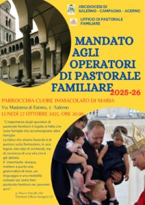 Lunedì 27 ottobre alle ore 20.00, presso la parrocchia Cuore Immacolato di Maria in Salerno si terrà il conferimento del Mandato agli Operatori di Pastorale Familiare organizzato dall’Ufficio per la Pastorale della Famiglia.