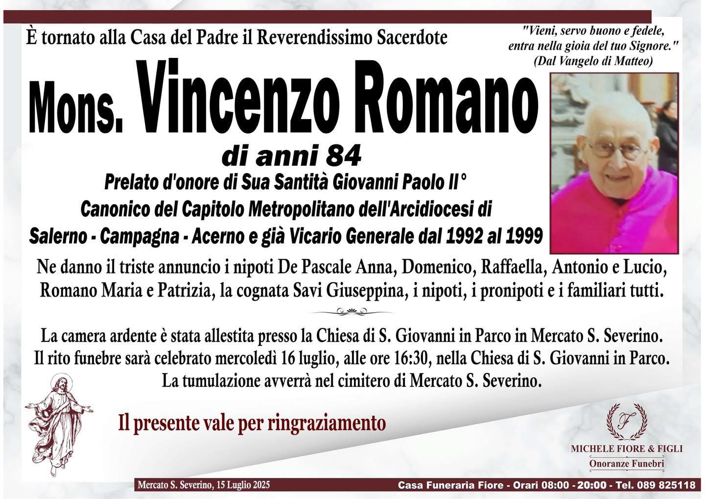 Mons. Vincenzo (Carmine Ciriaco) Romano, è nato a Mercato S. Severino il 6 febbraio 1941 da Raffaele e Maria D’Arienzo. Fu battezzato nella chiesa di S. Maria delle Grazie il 9 febbraio 1941. Dopo aver frequentato le scuole elementari e la prima media a Mercato S. Severino, entrò nel seminario arcivescovile di Salerno nel 1953 e successivamente nel pontificio seminario regionale “Pio XI” di Salerno, frequentando il triennio liceale e gli studi teologici.