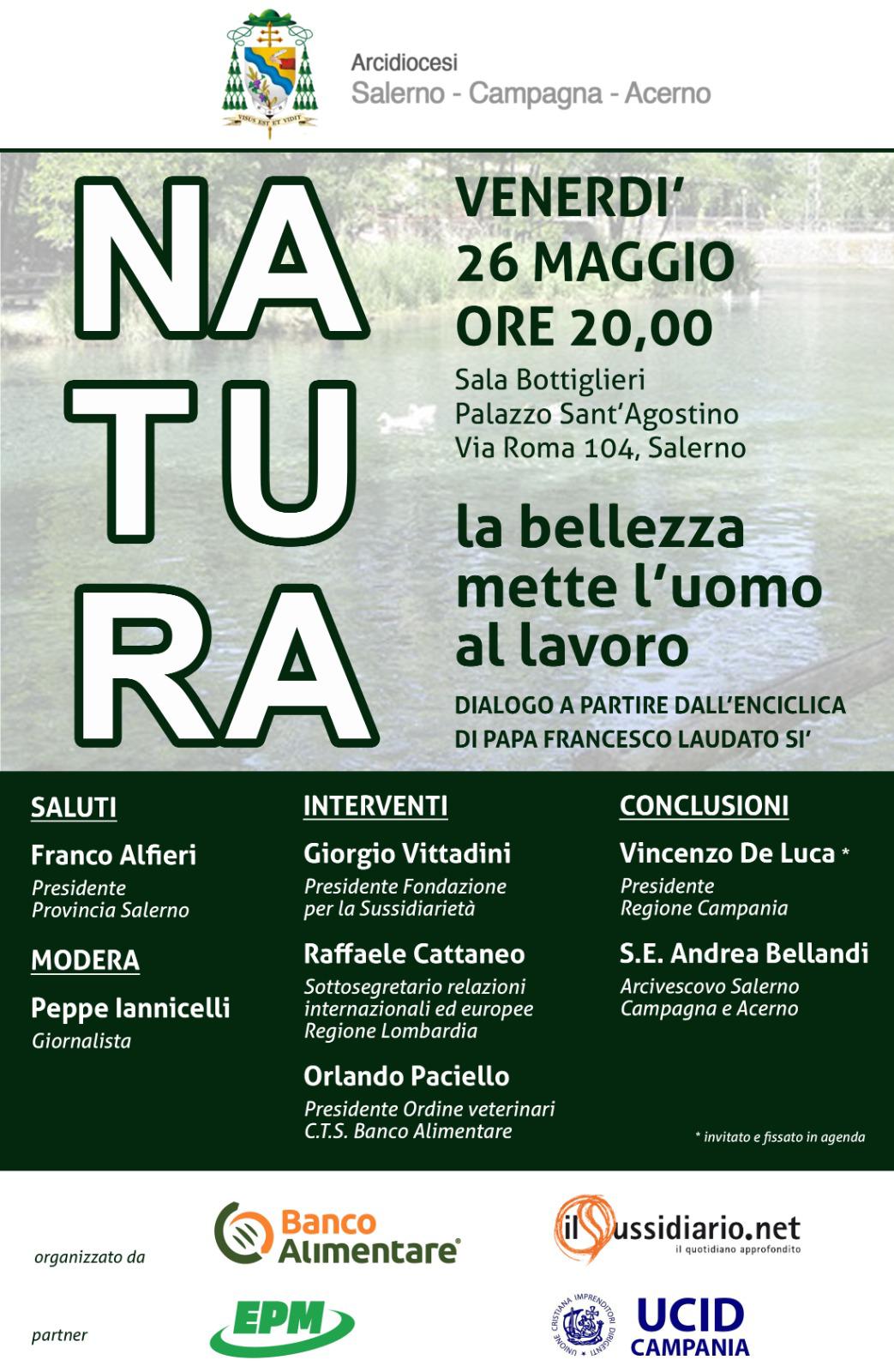 Venerdì 26 maggio alle ore 20.00 presso il Palazzo S. Agostino Salerno si tiene un dialogo pubblico a partire dall’enciclica Laudato si’ di Papa Francesco organizzato dall’Arcidiocesi di Salerno-Campagna-Acerno in collaborazione con il Banco Alimentare Campania ed il Sussidiario.net.