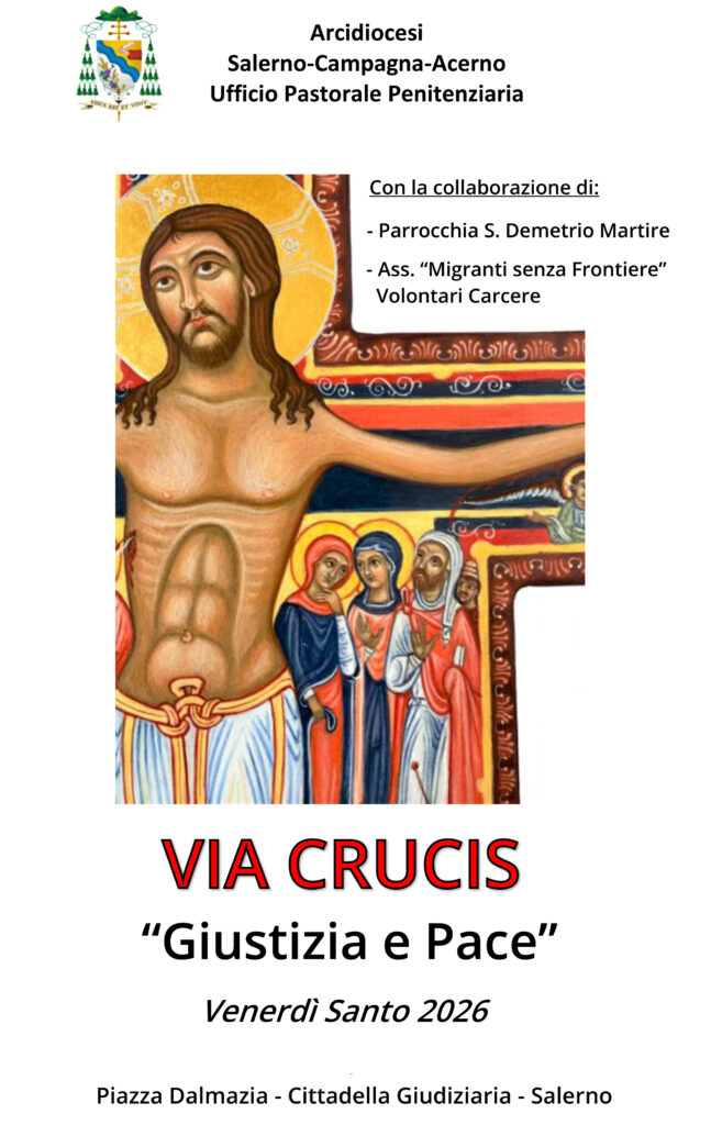 È in programma il 3 aprile 2026, alle ore 20.30, in piazza Dalmazia, dinanzi alla Cittadella Giudiziaria, la Via Crucis “Giustizia e pace” presieduta dall’Arcivescovo di Salerno-Campagna-Acerno, S.E. Monsignor Andrea Bellandi e organizzata dalla Parrocchia San Demetrio Martire e dalla Pastorale Carceraria dell’Arcidiocesi. La comunità è invitata a vivere un momento intenso di preghiera e riflessione, nel segno della speranza e della responsabilità condivisa. “Pregare per la pace oggi significa impegnarsi concretamente affinché essa non sia solo assenza di conflitto, ma frutto autentico della giustizia. – osserva S.E. Monsignor Andrea Bellandi – Non può esserci vera pace senza il rispetto della dignità di ogni persona, senza verità, senza percorsi di riconciliazione e senza un impegno reale per il bene comune. L’appuntamento intende essere un segno visibile di dialogo e comunione tra realtà diverse ma profondamente unite nel servizio alla giustizia e alla persona”.