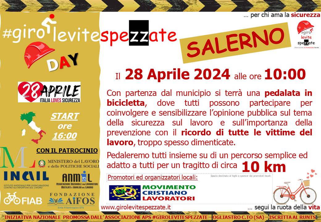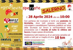 Domenica 28 aprile alle ore 10.00, dal Municipio di Salerno, partirà la pedalata per coinvolgere e sensibilizzare l’opinione pubblica sul tema della sicurezza sul lavoro. Un’iniziativa nazionale che coinvolge enti, istituzioni e associazioni, promossa dall’associazione “Giro le vite spezzate” in collaborazione con il Movimento Cristiano Lavoratori di Salerno.