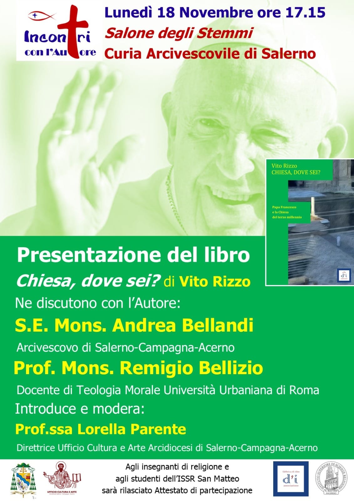Lunedì 18 novembre alle ore 17.15, presso il Salone degli Stemmi nel Palazzo Arcivescovile di Salerno, si terrà la presentazione del libro dal titolo “Chiesa dove sei? Papa Francesco e la Chiesa del terzo millennio” di Vito Rizzo.