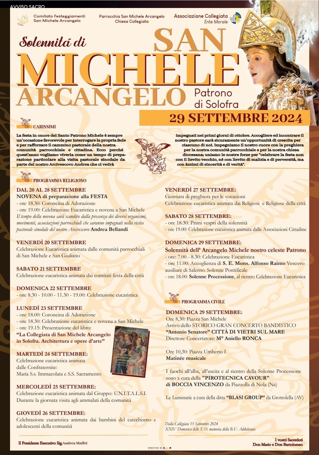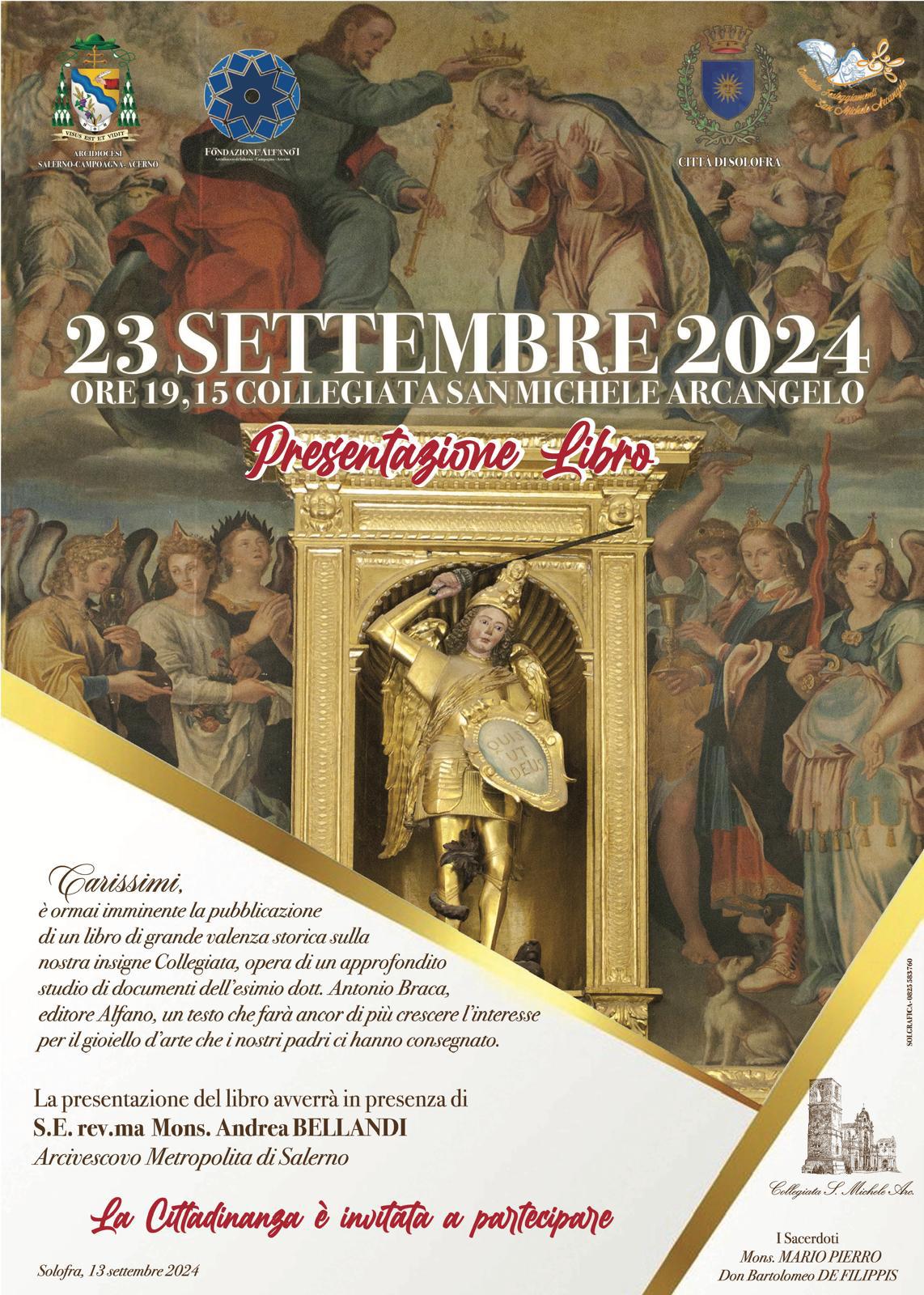 Lunedì 23 settembre, alle ore 19.15, presso la Collegiata San Michele Arcangelo in Solofra, nell’ambito dei festeggiamenti della solennità di San Michele Arcangelo, si terrà la presentazione de un libro del dott. Antonio Braca, edizioni Alfano, dal titolo “La Collegiata di San Michele Arcangelo in Solofra. Architettura e opere d’arte”.