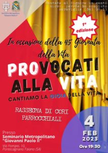 In occasione della 45ª Giornata della Vita, sabato 4 febbraio 2023 alle ore 19.30, il Seminario Metropolitano “Giovanni Paolo II” ospiterà presso l’Auditorium la prima rassegna di cori parrocchiali dell’Arcidiocesi di Salerno-Campagna-Acerno. Alla rassegna “Provocati alla vita” i cori saranno invitati a portare due canti con argomento “Vita e vocazione”.