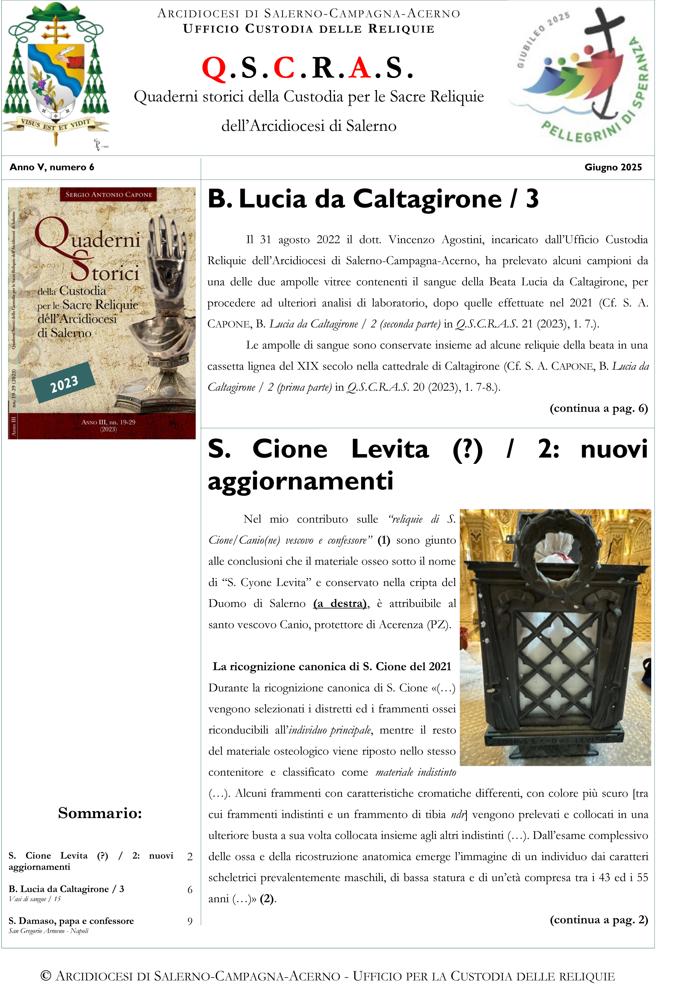 Nell’edizione QSCRAS numero 6 del mese di giugno, in apertura, troviamo due approfondimenti: il primo è uno studio sulle analisi condotte su due ampolle vitree contenenti il sangue della Beata Lucia da Caltagirone; il secondo approfondimento contiene le conclusioni sulle analisi del materiale osseo di “S. Cyone Levita” conservato nella cripta del Duomo di Salerno.
