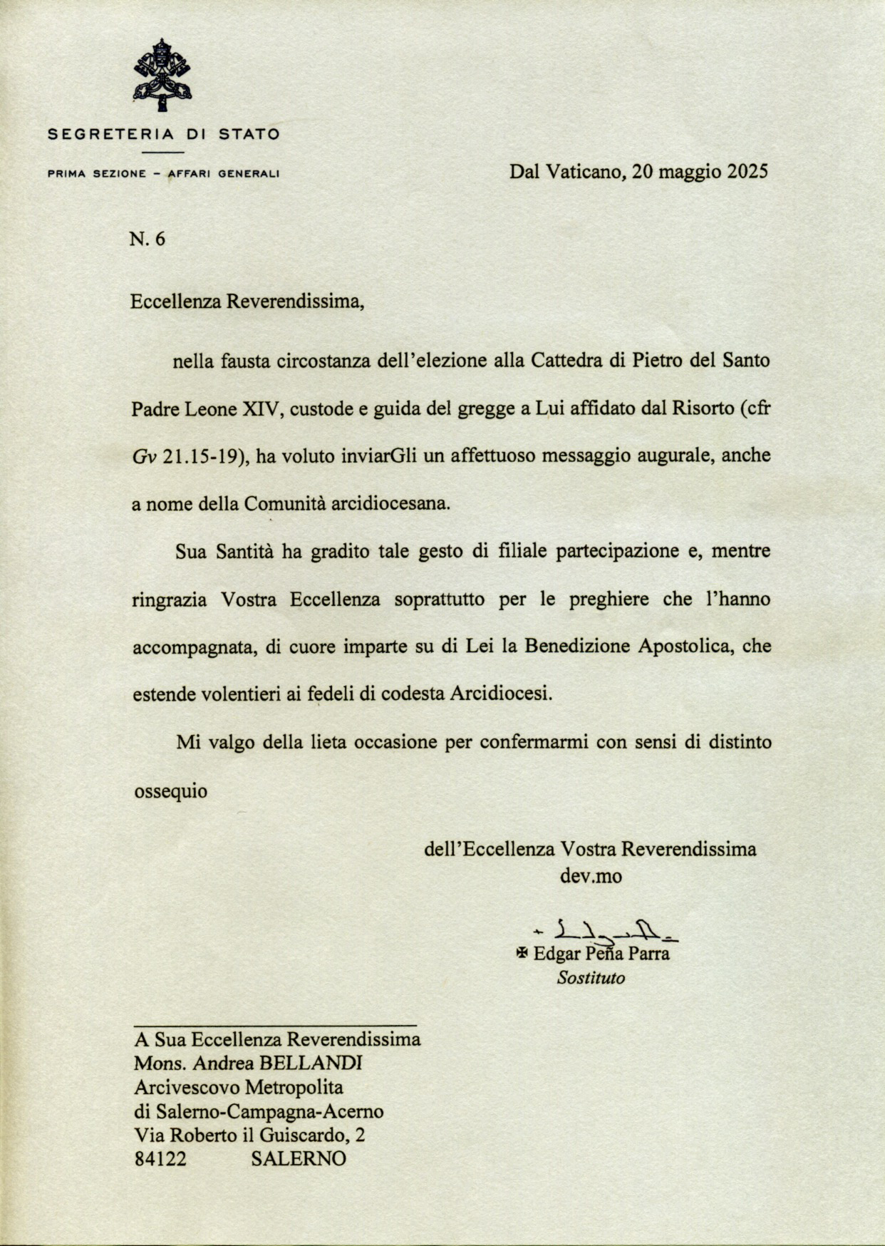 Ringraziamenti pervenuti dalla Segreteria di Stato a seguito dei voti augurali espressi al Santo Padre Leone XIV in occasione della sua elezione.