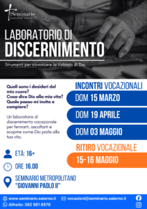 Il Gruppo Vocazionale del Seminario Metropolitano “Giovanni Paolo II” organizza un Laboratorio di Discernimento. Il percorso, a cadenza mensile, si terrà presso il Seminario nelle seguenti date: